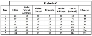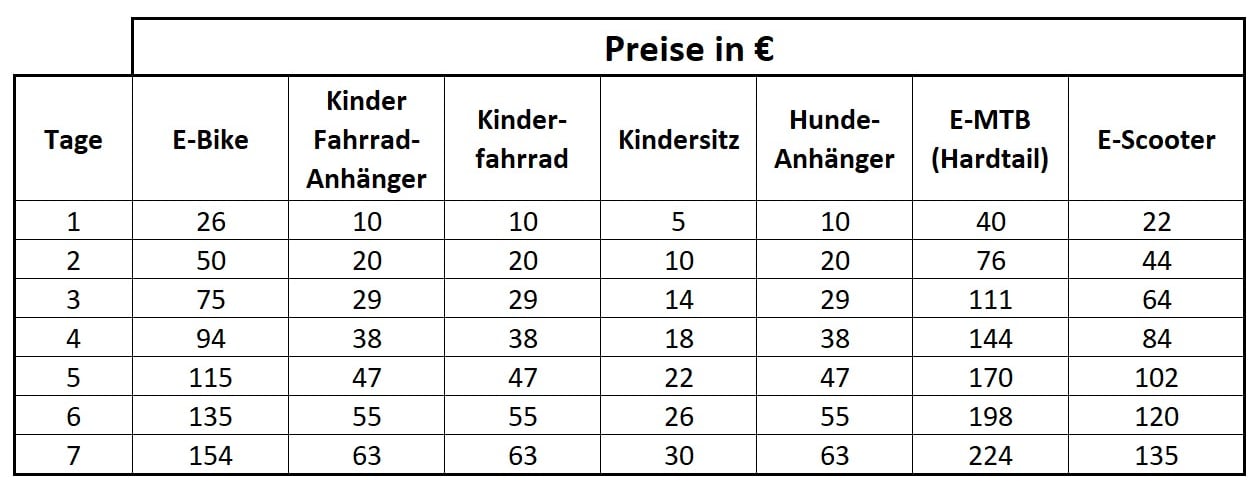 Die angegebenen Preise beziehen sich jeweils auf ganze Tage. Der erste Tag bei Leihbeginn startet bei Abholung ab 8:00 Uhr und der letzte Tag endet bei der Rückgabe spätestens um 19:00Uhr.